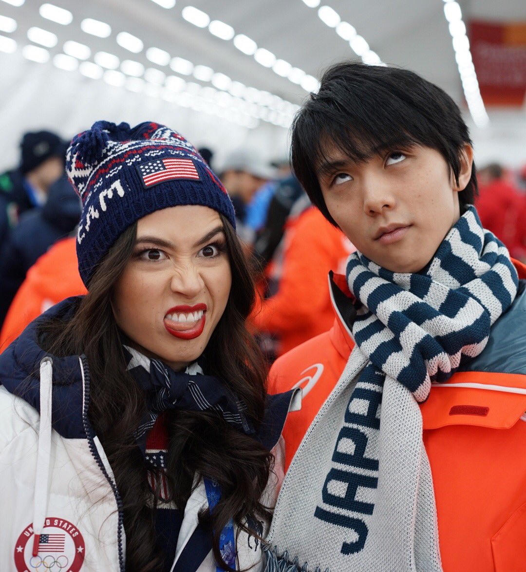 羽生結弦選手の隣にいるマディソン選手のモノマネをする女性がかなり気になるところですが、